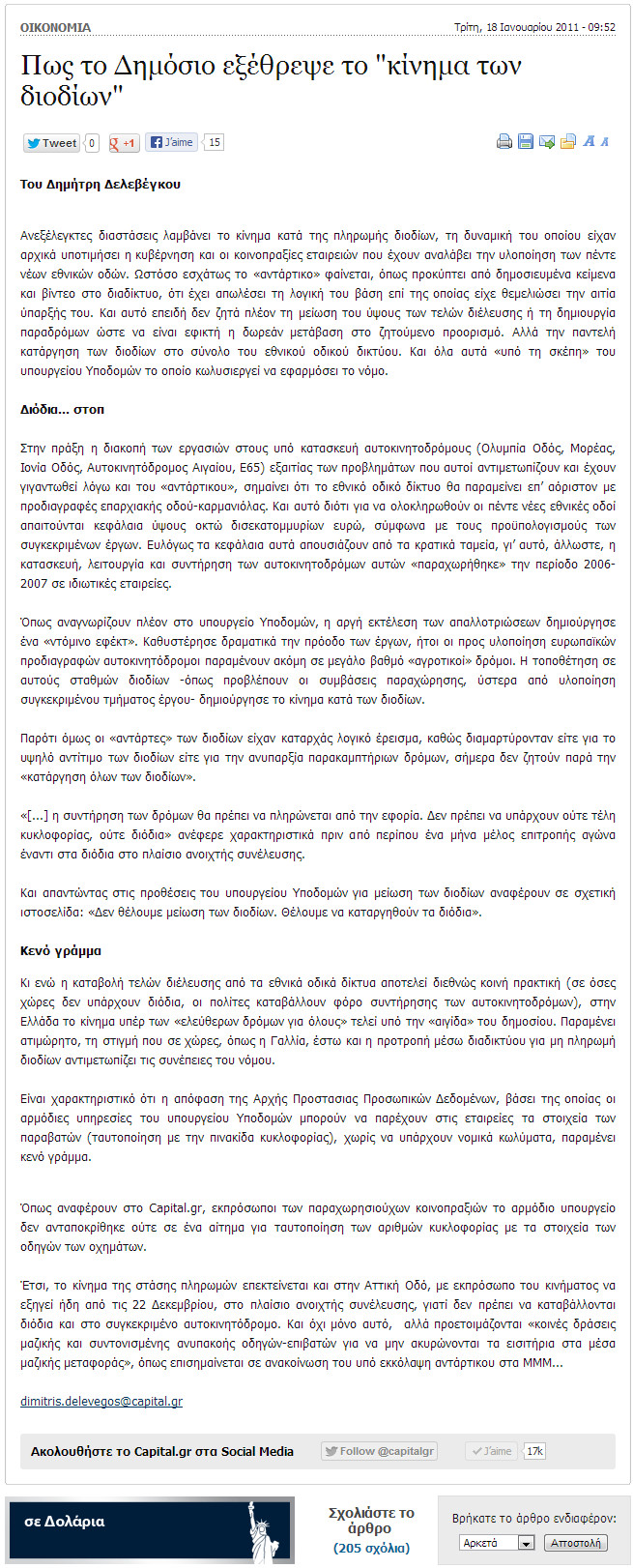 Κι ενώ η καταβολή τελών διέλευσης από τα εθνικά οδικά δίκτυα αποτελεί διεθνώς κοινή πρακτική (σε όσες χώρες δεν υπάρχουν διόδια, οι πολίτες καταβάλλουν φόρο συντήρησης των αυτοκινητοδρόμων), στην Ελλάδα το κίνημα υπέρ των «ελεύθερων δρόμων για όλους» τελεί υπό την «αιγίδα» του δημοσίου. Παραμένει ατιμώρητο, τη στιγμή που σε χώρες, όπως η Γαλλία, έστω και η προτροπή μέσω διαδικτύου για μη πληρωμή διοδίων αντιμετωπίζει τις συνέπειες του νόμου.