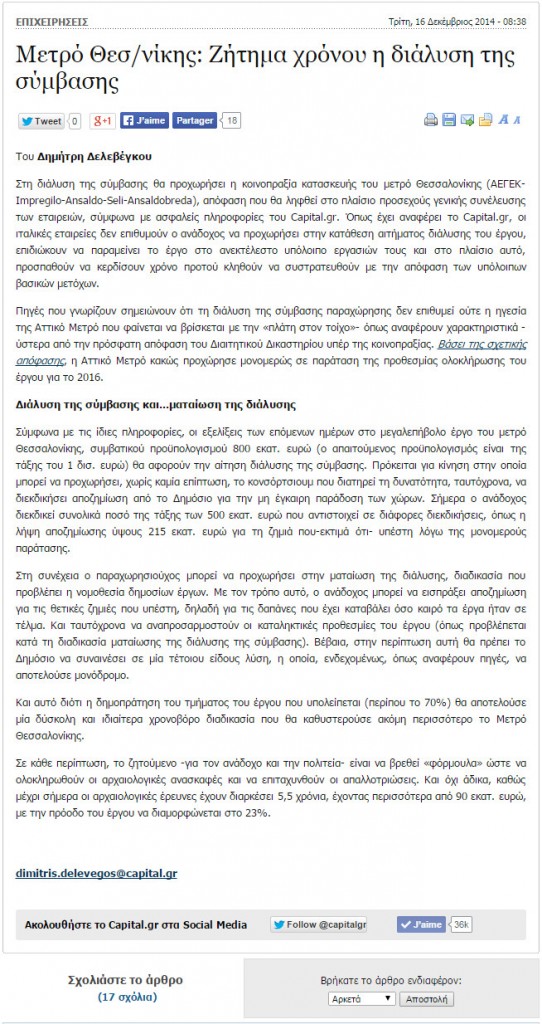 Στη διάλυση της σύμβασης θα προχωρήσει η κοινοπραξία κατασκευής του μετρό Θεσσαλονίκης (ΑΕΓΕΚ-Impregilo-Ansaldo-Seli-Ansaldobreda), απόφαση που θα ληφθεί στο πλαίσιο προσεχούς γενικής συνέλευσης των εταιρειών, σύμφωνα με ασφαλείς πληροφορίες του Capital.gr. Όπως έχει αναφέρει το Capital.gr, οι ιταλικές εταιρείες δεν επιθυμούν ο ανάδοχος να προχωρήσει στην κατάθεση αιτήματος διάλυσης του έργου, επιδιώκουν να παραμείνει το έργο στο ανεκτέλεστο υπόλοιπο εργασιών τους και στο πλαίσιο αυτό, προσπαθούν να κερδίσουν χρόνο προτού κληθούν να συστρατευθούν με την απόφαση των υπόλοιπων βασικών μετόχων.
